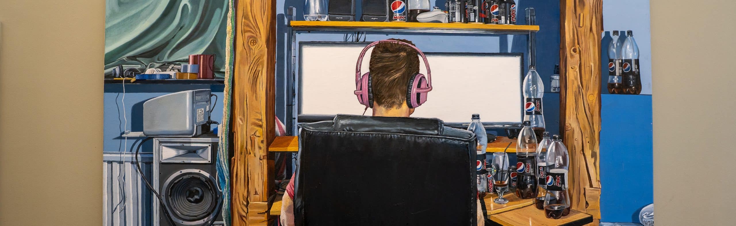 Vänd från betraktaren och vid skärmen eller spelhörnan och med hörlurar sitter en ung man i Isak Anshelms realistiska dystopi ”Unknown Entity” (Okänd enhet).